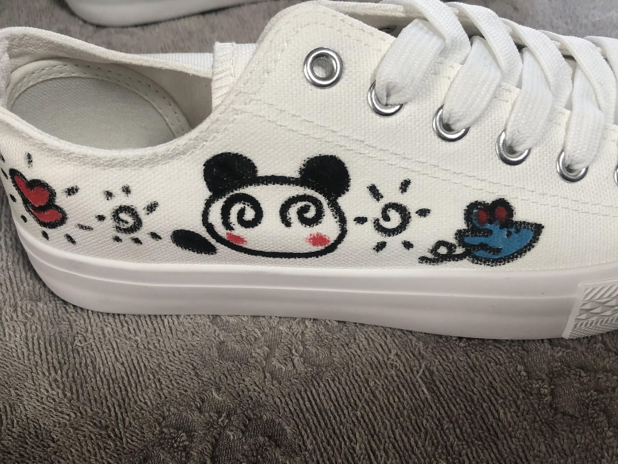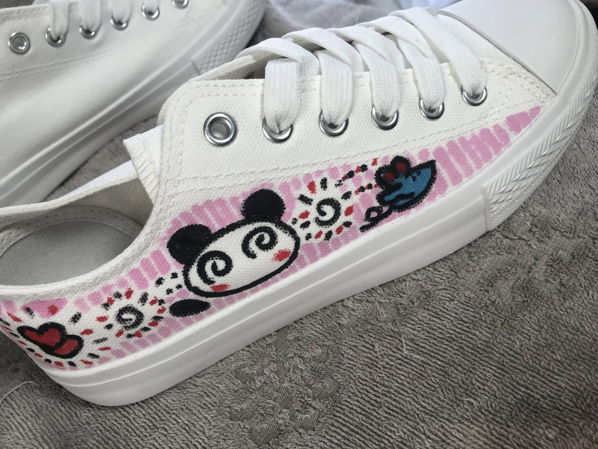 白のキャンバスシューズにサラが直筆で絵を入れていくオーダーメイドのシューズです。パンちゃんかニャンちゃんか、あるいは両方かメインの色とサイドの色をご指定ください。その他はお任せになります。靴なのでサイズもご記入ください。※基本的にピッタリサイズの靴ですのでご注意ください。サイズによって紐靴もしくは紐無靴になる場合があります。